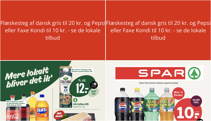 Spar tilbyder Pepsi eller Faxe Kondi i flere varianter til kun 10 kr. pr. flaske (1,5 liter). Bemærk, at der er en begrænsning på 4 flasker pr. kunde pr. dag, hvorefter prisen er 21,95 kr. pr. flaske. Tilbuddet gælder fra fredag den 13. februar til og med torsdag den 19. februar 2026.